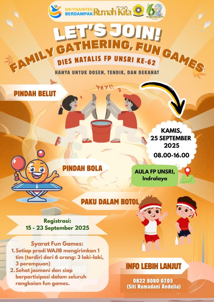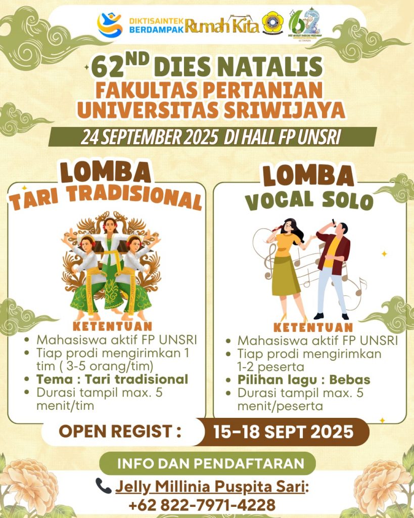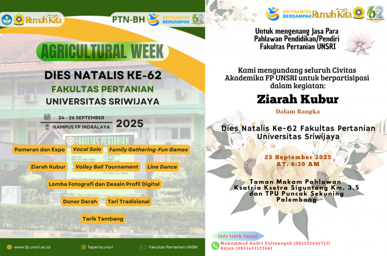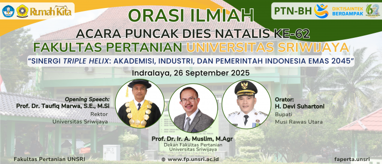 Fakultas Pertanian Universitas Sriwijaya tahun ini genap berusia 62 tahun sejak didirikan pada tahun 1963. Sebagai salah satu fakultas tertua di lingkungan Universitas Sriwijaya, Fakultas Pertanian telah berkontribusi besar dalam mencetak sumber daya manusia unggul di bidang pertanian dan terus memperkuat peran strategisnya dalam pembangunan pertanian nasional. Perayaan Dies Natalis tahun ini mengusung tema “Sinergi Triple Helix: Akademisi, Industri, dan Pemerintah untuk Pertanian Inklusif menuju Indonesia Emas 2045”, yang mencerminkan semangat bersinergi dan visi jangka panjang dalam mendukung ketahanan pangan dan pembangunan berkelanjutan di Indonesia.