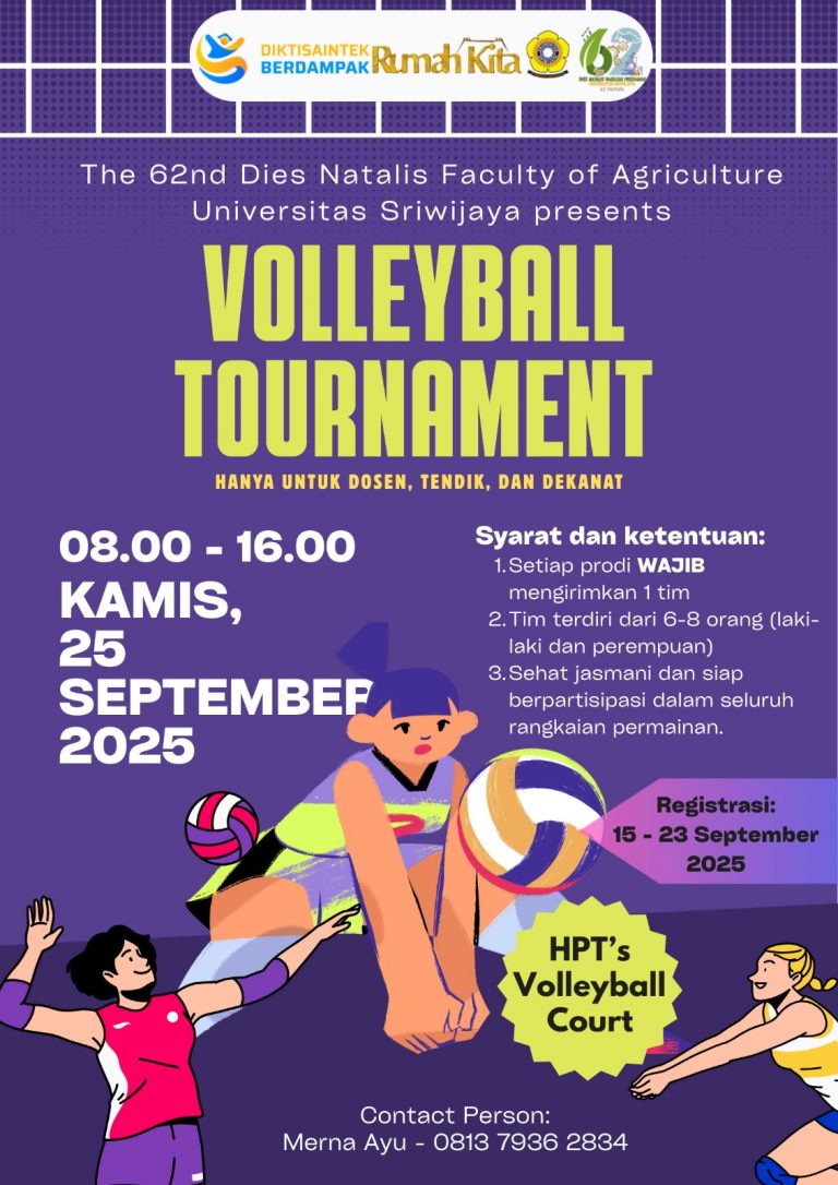 Sebagai bagian dari pengembangan soft skill dan sportivitas mahasiswa, akan diselenggarakan pula Liga Pertanian pada bulan Oktober 2025. Melalui kegiatan ini, Fakultas Pertanian ingin menanamkan nilai-nilai kolaboratif, kompetitif, dan kreatif kepada para mahasiswa. Dengan semangat peringatan Dies Natalis ke-62 ini, Fakultas Pertanian Universitas Sriwijaya berkomitmen untuk terus berperan aktif dalam mendorong lahirnya inovasi, kebijakan, dan sinergi multipihak dalam menghadapi berbagai tantangan pertanian nasional, sekaligus berkontribusi nyata menuju Indonesia Emas 2045.