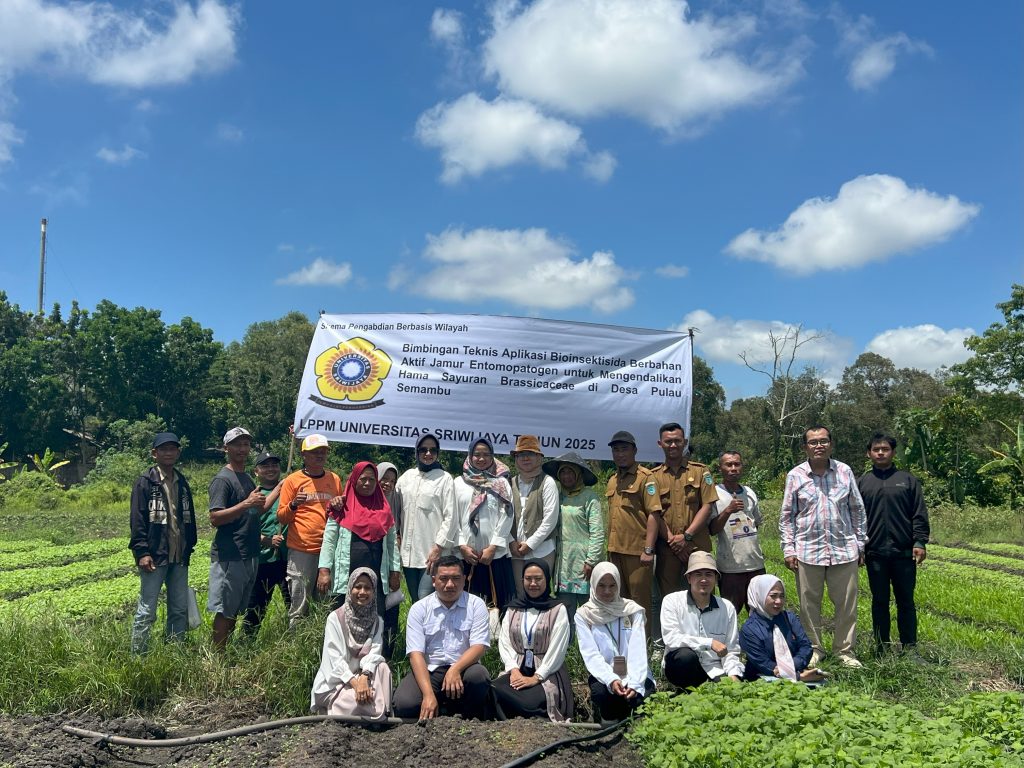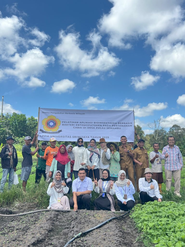 Indralaya, 22 September 2025 – Jurusan Hama dan Penyakit Tumbuhan (HPT) Program Studi Proteksi Tanaman, Fakultas Pertanian Universitas Sriwijaya melaksanakan pengabdian masyarakat sebagai wujud nyata implementasi hasil penelitian. Terdapat dua judul dalam kegiatan ini, yaitu “Bimbingan Teknis Aplikasi Bioinsektisida Berbahan Aktif Jamur Entomopatogen untuk Mengendalikan Hama Sayuran Brassicaceae di Desa Pulau Semambu” dan “Pelatihan Aplikasi Bioinsektisida Berbasis Bakteri Entomopatogen pada Tanaman Cabai di Desa Pulau Semambu”. Kegiatan ini diikuti oleh 22 petani yang tergabung dalam Kelompok Tani Tunggal Makmur dan Subur Makmur. Pengabdian masyarakat ini diketuai oleh Prof. Dr. Ir. Siti Herlinda, M.Si. dan Erise Anggraini, S.P., M.Si., Ph.D. dengan anggota tim Dr. Jelly Milinia Puspita Sari, S.P., M.Si., Dellania Eka Rindiani, S.P., M.Si., serta Ghita Athalina, B.Eng., M.Eng. Sejumlah dosen lain juga turut mendukung pelaksanaan kegiatan, di antaranya Weri Herlin, S.P., M.Si, Ph.D., Dr. Rahmat Pratama, S.Si., Rahmad Fadli, SP., M.Si., Nurlaili Habibi Danata, S.P., M.P., Anton Meilus Putra, S.P., M.P. dan Titi Tricahyati, S.P., M.Si. Tidak hanya melibatkan dosen, mahasiswa juga ikut berpartisipasi aktif dalam mendampingi petani, diantaranya Muhammad Sidik, M. Alfi Syahru Ramadhan, Axel Chritian Sirait, Muhammad Tegar Yusniawan, Alamsyah dan Muhammad Arifudin.