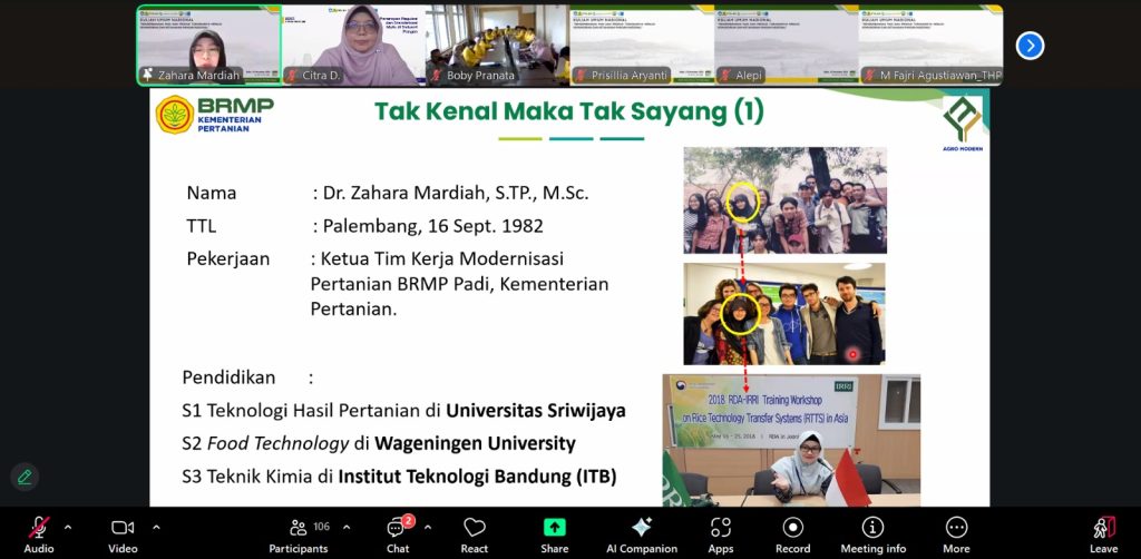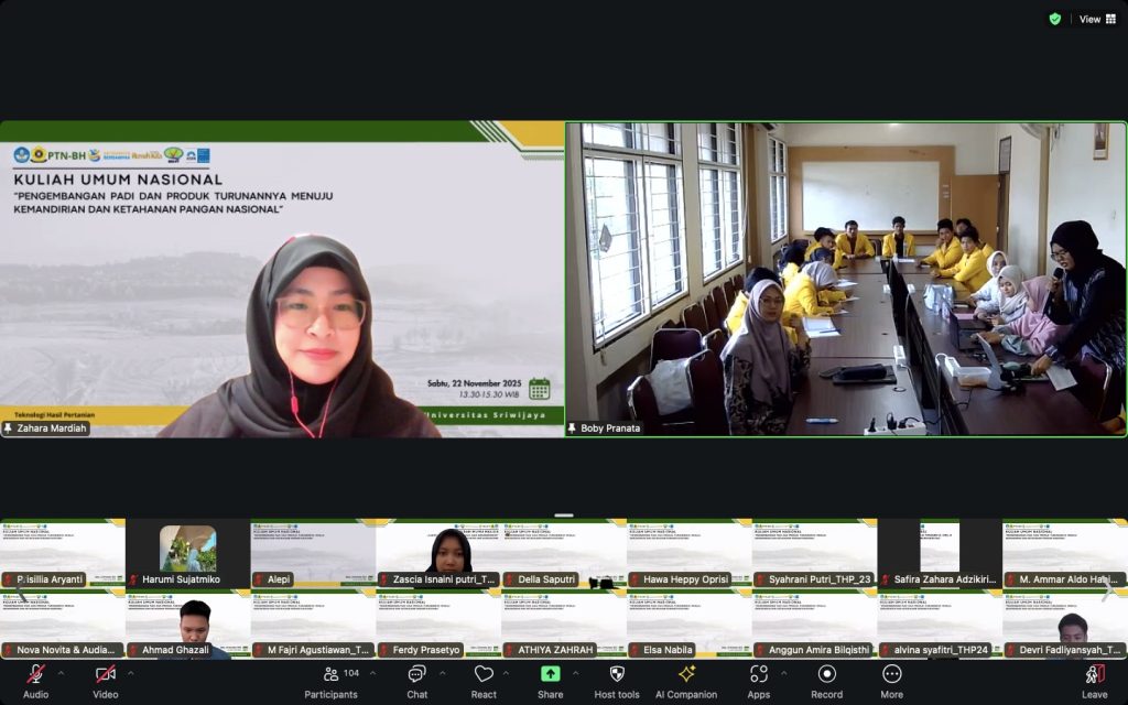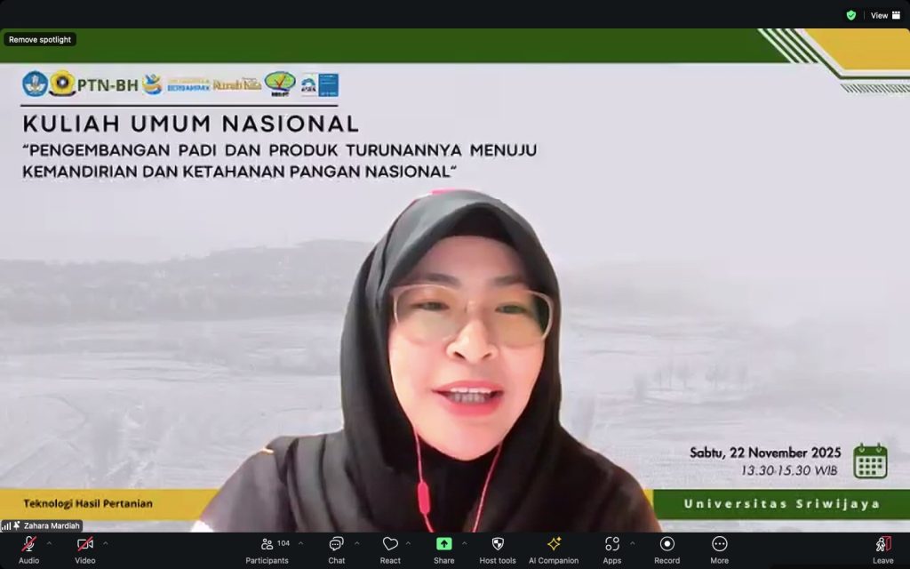 Sabtu (22/11/2025), Program Studi Teknologi Hasil Pertanian Fakultas Pertanian Universitas Sriwijaya mengadakan kuliah umum nasional dengan tema “Pengembangan Padi dan Produk Turunannya Menuju Kemandirian dan Ketahanan Pangan Nasional” secara hybrid di Ruang Seminar Fakultas Pertanian Universitas Sriwijaya Kampus Palembang. Dosen tamu dalam kegiatan ini adalah Dr. Zahara Mardiah, S.TP., M.Sc., Ketua Tim Kerja Modernisasi Balai Besar Perakitan dan Modernisasi Pertanian Tanaman Padi (BRMP Padi), Subang, Jawa Barat. Beliau juga merupakan alumni Program Studi Teknologi Hasil Pertanian Angkatan 2000.
